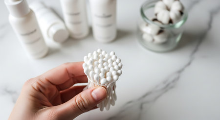 A hand holds a bundle of cotton swabs in front of skincare products and a jar of cotton balls on a marble surface.