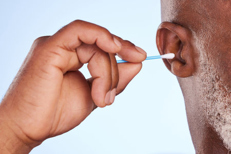 Studio, man and hand with cotton swab for cosmetics, self care maintenance and removal of wax. Mature person, product and ear with bud for hygiene, health and cleaning of dirt on white background
