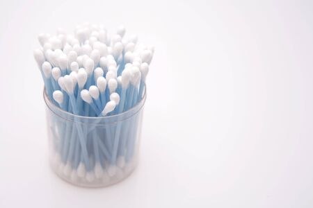 Cotton sticks ear blue plastic on a white background. Personal hygiene and care. Cosmetology and medicine. High quality photo