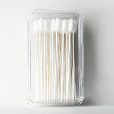 A clear plastic container filled with a neatly arranged pack of cotton swabs rests on a white surface. Perfect for personal hygiene and cosmetic applications.