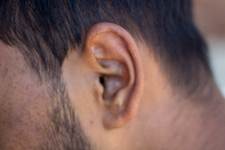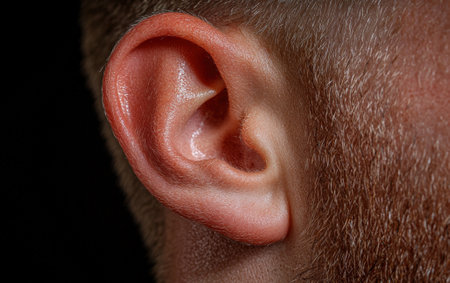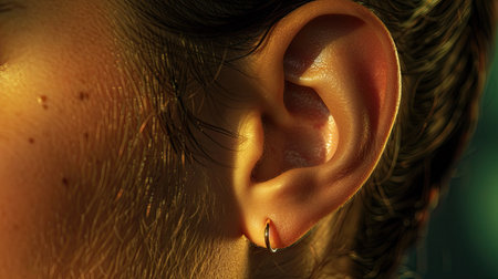 Detailed view of a man's ear showing skin pores and realistic anatomy under gentle lighting, suitable for health or audio-related visuals.