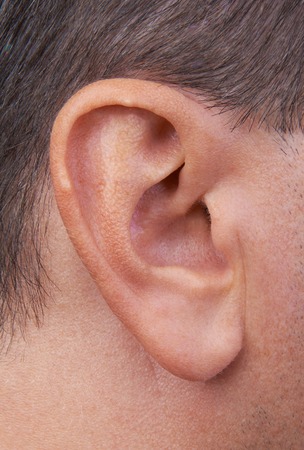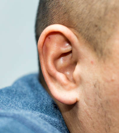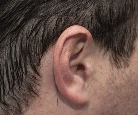 Close-up of a man's ear. Macro shot of human ear anatomy. Right ear isolated on a horizontal background with space for text.