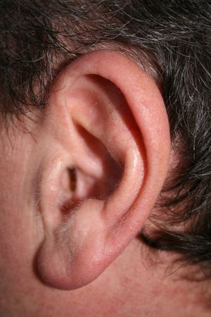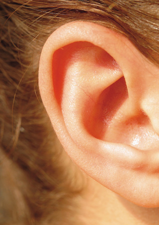 A close-up shot of a human ear, showing detailed skin texture and hearing anatomy with a dark background.