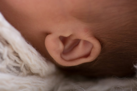 Child ear close-up. copyspace. Deafness. Concept of medical exam and treatment by an otolaryngologist. Hearing check and recovery. Proper care and cleaning of ears. Audio perception of information.