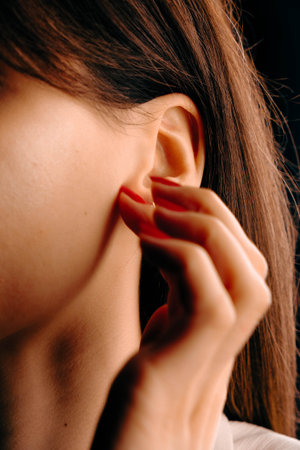 A close-up of a female ear, emphasizing its contours and details. Ideal for healthcare, beauty, and personal grooming imagery.
