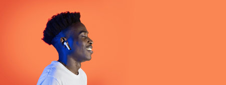Unrecognizable Black guy listening to music through modern red earbuds outdoors