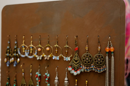 Various shapes and shades of earrings , handicrafts on display during the Handicraft Fair in Kolkata , earlier Calcutta, West Bengal, India. It is the biggest handicrafts fair in Asia.