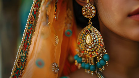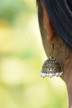 Close-up of an Indian woman's intricately designed earrings, with ample copy space on the left.