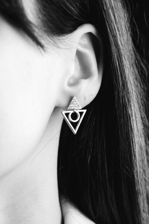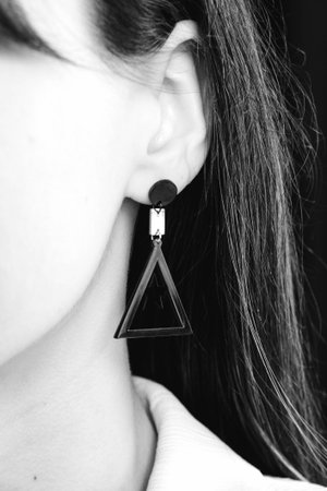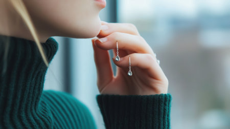 Close-up of a womanaes ear with elegant, modern drop earrings, capturing their sleek design and sophisticated beauty