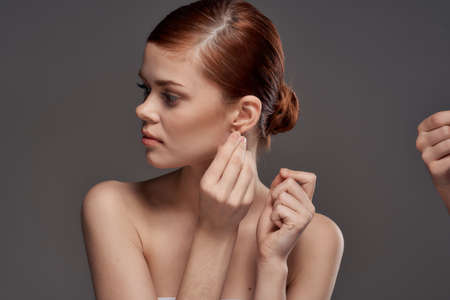 Beautiful woman decorating naked shoulders cosmetics collected hair in a bun gray background