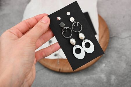 Fashionable accessories and jewelry on a marble background. Selective focus.