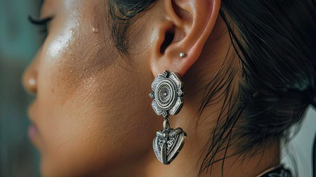 Detailed shot of a modelaes ear with unique, handcrafted silver earrings, showcasing their artistic design and intricate details