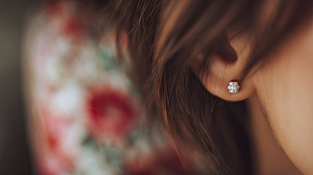 This image captures a close-up view of a young woman's ear adorned with an elegant earring, featuring a delicate design, set against a beautifully blurred floral background, creating an intimate and stylish aesthetic.