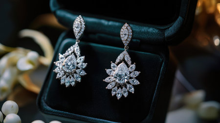 Beautifully arranged pair of diamond drop earrings on a luxurious velvet jewelry box, showcasing their intricate design and shine