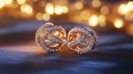 A stunning pair of rose gold earrings adorned with sparkling diamonds, set against a soft bokeh background, perfect for showcasing luxury and elegance in jewelry design.