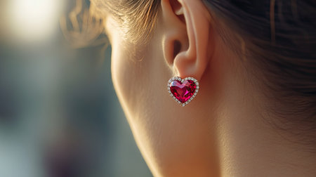 Close-up of a woman's ear showcasing elegant heart-shaped earrings adorned with sparkling red gemstones. Perfect for adding a touch of luxury and sophistication.