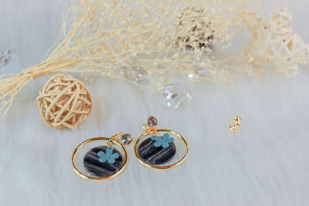 These earrings are handmade by ourselves. Earrings made of raw materials purchased online. Round stones with patterns. Metal ring. We also decorated with diamonds above. Next to it are rattan dec