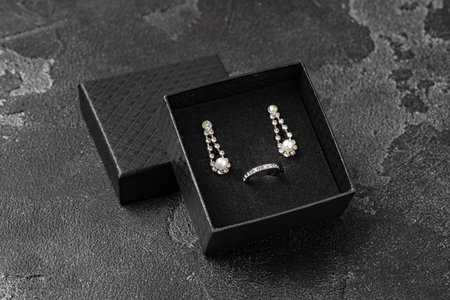 Silver bridal engagement ring with pearl and silver earrings with pearls on a red background. Beautiful light. Photo of wedding details.