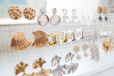 Elegant display of various gold and silver earrings on a transparent holder with a soft-focus background.
