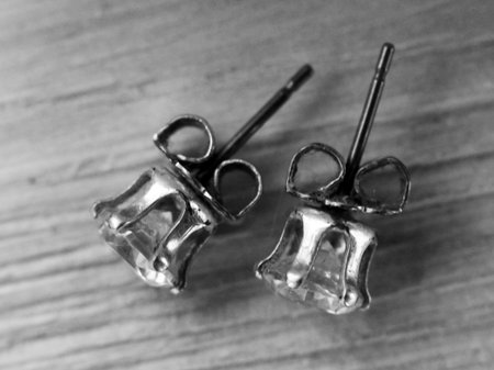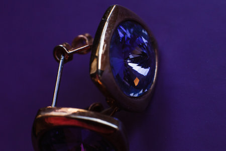 A closeup shot of earrings with alexandrite purple precious stone on isolated background