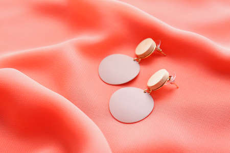 Vintage bijouterie jewelry. Beautiful handmade silver earrings on pink silk background. Flat lay, top view copy space and empty space for text