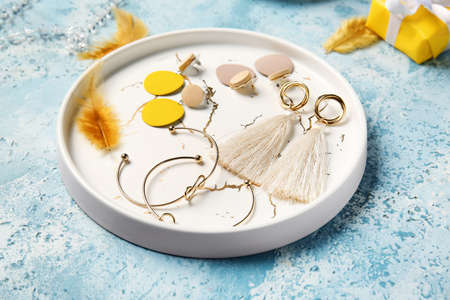 Top view of fashion jewelry and accessories on bright color background. Luxurious jewelry bijouterie and trendy concept.