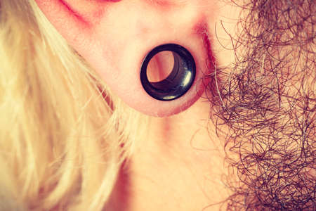 Black earring in a man's ear. close-up