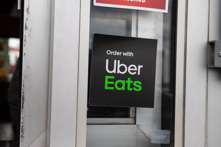 Los Angeles, California, USA - 21 November 2019: Uber Eats logo on phone screen with icon on laptop on blurry background, Illustrative Editorial.