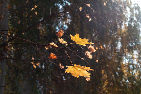 Yellow maple leaves on a blurred background in the autumn forest