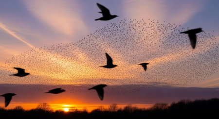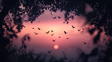 A breathtaking sunset filled with flying birds creates a serene and tranquil atmosphere, framed by lush foliage. This stunning twilight scene captures the beauty of nature at dusk.