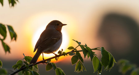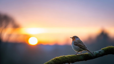 A robin sits on a branch with a blurred sunset in the background. The image has a shallow depth of field, with the bird and foreground branch in focus. Warm colors dominate the scene, suggesting a peaceful outdoor setting. This photograph is suitable for various commercial uses, including editorial and design projects.