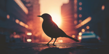 AI Generated. Silhouette of bird in sunlit urban setting with shadows
