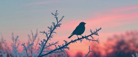 AI Generated. Silhouette of a Bird on a Frost Covered Branch at Sunrise