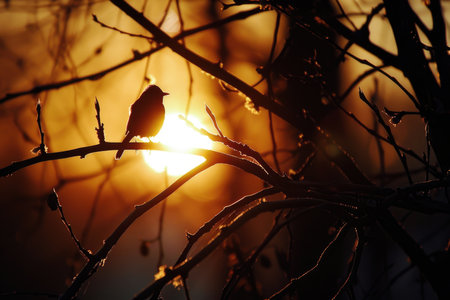 A small bird perched on a branch is silhouetted against a warm, glowing sunset. The golden hour light creates a beautiful rim-light effect, emphasizing the peaceful nature scene.