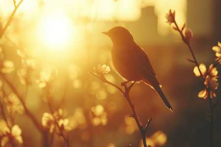 A tranquil silhouette of a bird perched on a branch, surrounded by blossoming flowers against a warm sunset backdrop. The scene captures nature