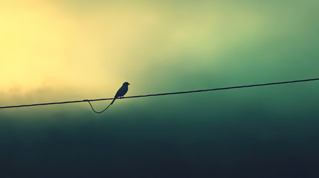 A small bird sits quietly on a thin wire while a soft pastel sky transitions from warm colors to twilight. The tranquil scene captures nature's beauty at dusk.