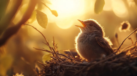 An enchanting shot of a baby bird chirping from its nest at dawn, with soft morning light illuminating its delicate features, evoking a sense of new beginnings.