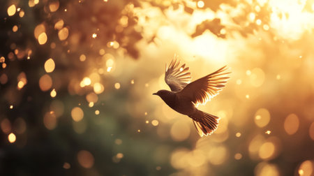 Bird in flight with outstretched wings, illuminated by warm sunlight, creates stunning visual effect. scene captures beauty of nature and grace of bird as it soars through air