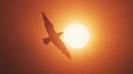 Silhouette of a bird gliding across the glowing sunset sky, sun low on the horizon, casting warm golden and amber tones in the background.
