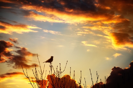 Bird flying into the sunset singing against a spectacular sunset