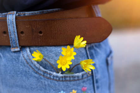 Showcase daffodils growing in a jeans pocket, blending floral fashion and botanical elegance