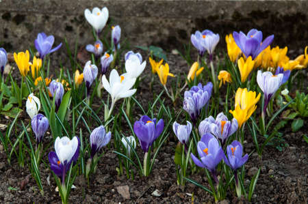 Spring bright background with blooming purple, lilac, yellow Crocus flowers in early spring. Crocus Iridaceae (iris family), banner image with sun glare