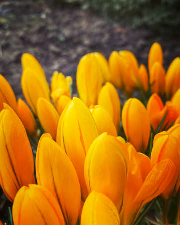 Yellow crocuses growing up in small bunches and is one of the first signs of spring