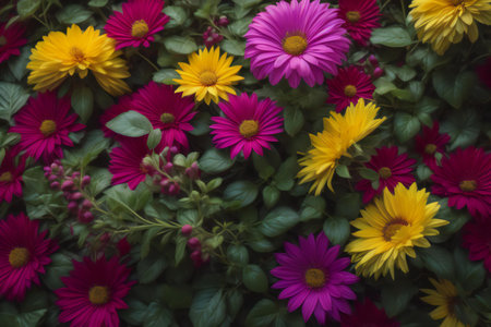 Colorful daisy flowers background. Top view with copy space. generative ai