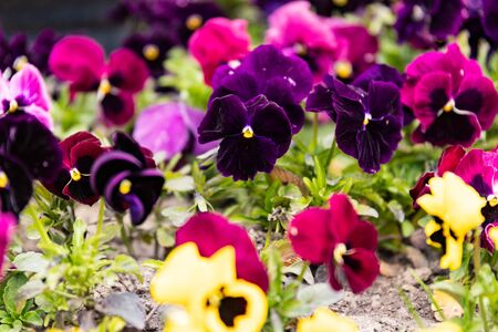 Pansy plant in the garden, viola tricolor in the spring sunshine.