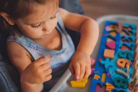Child girl playing with educational toys in daycare centre. Childrens wooden toy. Toddler learning numbers.