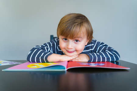 Little boy wearing striped t shirt sitting at the table, learning at home during coronavirus quarantine. Toddler playing with shaped stickers. Early development.