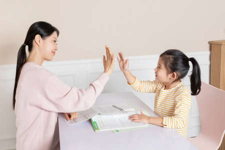 Asian Korean mother and daughter high five