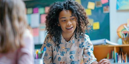 cheerful african american schoolgirl looking at classmate in classroom