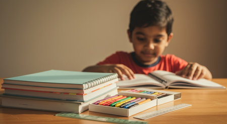A vibrant workspace scene featuring various educational tools and supplies, highlighting a chalkboard message 'Ready to Learn,' perfect for inspiring creativity in learning settings.